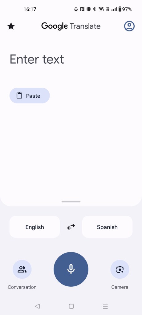 The microphone icon in the bottom center allows you to speak into the device and receive a translation, or allow someone else to speak into it (similar to “conversation”) but one phrase at a time.